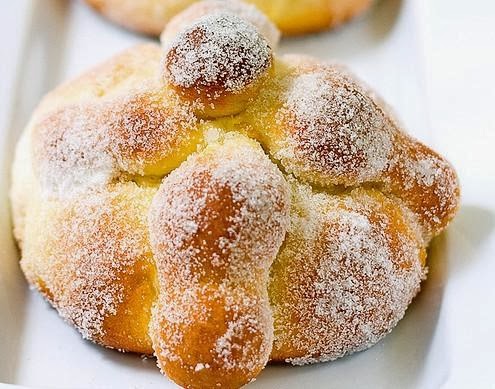 Sacar la mantequilla del refrigerador para que ponga a temperatura ambiente sin que se derrita.Disolver la levadura en el té de azahar.Colocar en un tazón la levadura y mezclarlo con 1/3 de taza de la leche y ½ de harina (esta masa debe ser pegajosa) .Dejarla reposar en un lugar cálido durante 30 minutos hasta que se esponje un poco.En el tazón de la batidora, colocar las 3 ½ tazas de harina restantes, batir con el azúcar, la sal y la ralladora de naranja.Agregar los huevos, el 1/3 de taza de leche restante y la masa con levadura. Batir a velocidad baja hasta que la masa comience a incorporarse.Subir la velocidad a media y agregar la mantequilla en trocitos poco a poco sin dejar de batir. La masa será pegajosa, pero no agregue más harina.Continúe batiendo durante 40 minutos hasta que la masa sea suave y se despegue de las orillas del tazón.Si la masa sigue siendo pegajosa después de 35 minutos de batido, puede agregar un poco más de harina (no debe ser más de 1/3 de taza).Engrase un tazón con aceite y meta la masa dentro.Cúbrala con una toalla húmeda y déjela reposar en un lugar cálido durante 60 minutos hasta que doble su tamaño.Sacar la masa ya fermentada del tazón, colocarla sobre la mesa y dividirla en tres partes iguales.A cada porción le cortaremos una tercera parte y la utilizaremos para hacer la decoración de arriba.Enrollar la parte grande de cada porción en forma de bola y colocarla en la bandeja.Colocar cada bola bien separada ya que se inflará. Aplastar cada una para que quede como un círculo un poco más panzón el centro.Espolvorear las porciones reservadas para decorar con suficiente harina. Amasarlas en forma de palitos largos.Doblarlos a la mitad para encontrar el centro y cortar una pequeña porción de las puntas para hacer una bolita que se colocará en el centro.Extender los dos tubitos sobre la mesa y extender cada uno con los dedos separados, utilizando 3 dedos de la mano derecha y dos de la izquierda, amasando de manera de formar una especie de “huesitos” como los de la columna vertebral.Colocar los dos tubitos de huesitos entrecruzados sobre cada bola de masa en la bandeja.Colocar las bolitas reservadas para el centro sobre la bandeja. Dejar reposar las bolas de masa ya formadas sobre la bandeja durante 60 minutos más para que se inflen, cubriendo con un trapo húmedo.Antes de hornear, poner un poco de agua en el centro de cada forma de masa y colocarle una bolita reservada.Precalentar el horno a 350° F (175° C). Hornear durante 30 a 40 minutos. Sacar la bandeja del horno y dejar enfriar 30 minutos, untar mantequilla derretida con una brocha y espolvorear con azúcar granulada.